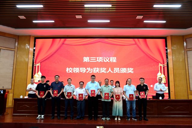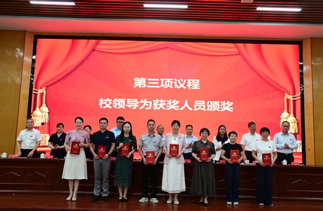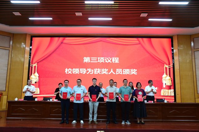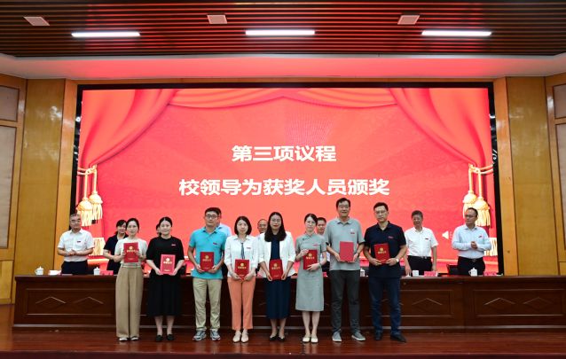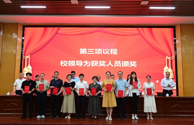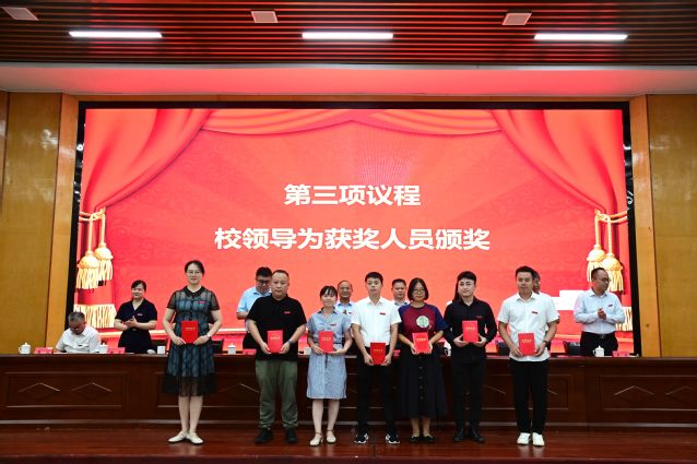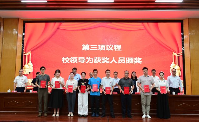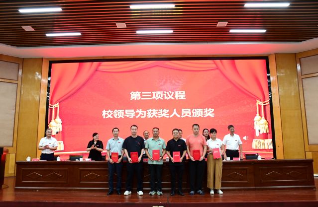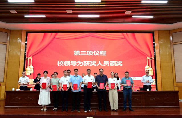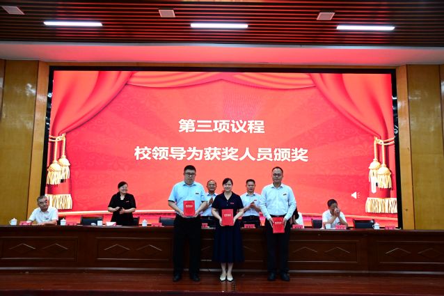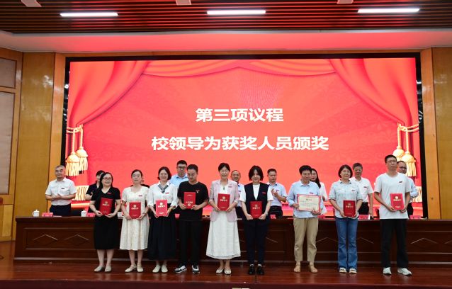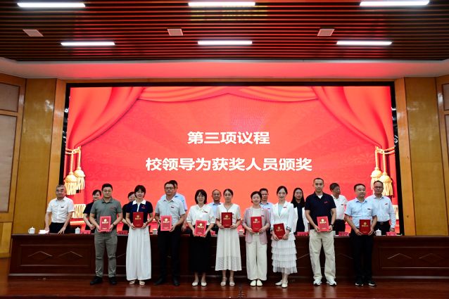 校党委委员、副校长余新卫宣读表彰决定,对获得2024~2025学年度优秀教师及先进教育工作者、教学管理先进个人、科研工作先进个人、学生管理先进个人、优秀辅导员、教学之星、科研之星、服务之星、最美辅导员等荣誉称号的教师进行表彰,校领导为获奖代表和教龄满35周年的教职工代表颁发荣誉证书。